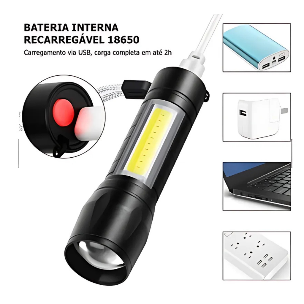 Com zoom ajustável, permite alterar o foco da luz – desde uma área ampla até um ponto concentrado para longas distâncias. Além disso, conta com 3 modos de funcionamento, incluindo strobo lateral, proporcionando versatilidade em diferentes situações.