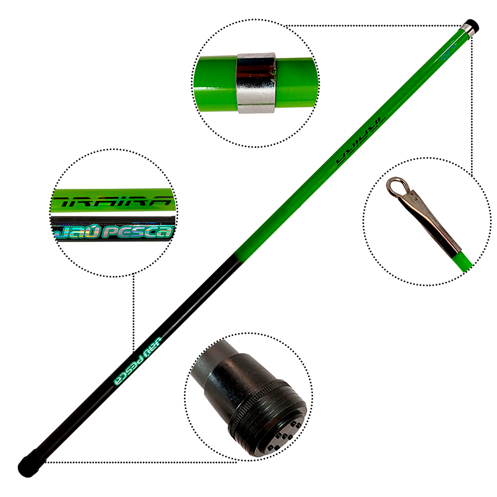 Vara de fibra de vidro com 40% carbono oferece um ótimo desempenho e com o preço acessível. Super Lançamento com anéis de aço entre os gomos, mais forte e resistente. Disponível nas cores verde e marrom.