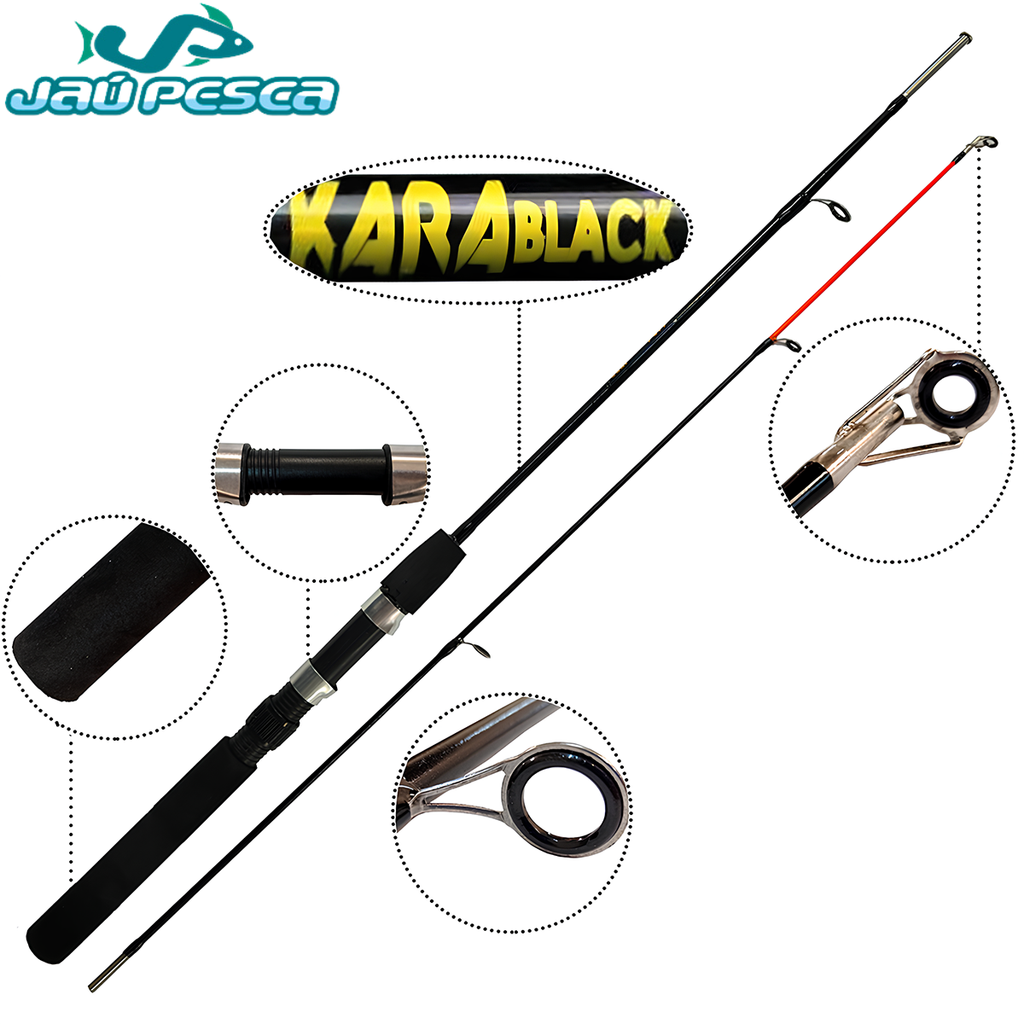 A Kara Black é uma excelente vara fabricada em grafite e carbono, leve e resistente, fabricada pela Albatroz e distribuida pela Jau Pesca. O cabo é ultra confortável anatômico revestido em E.V.A. Passador reforçados em óxido de alumínio oferece conforto, leveza em sua pescaria, sendo indicado para molinete.