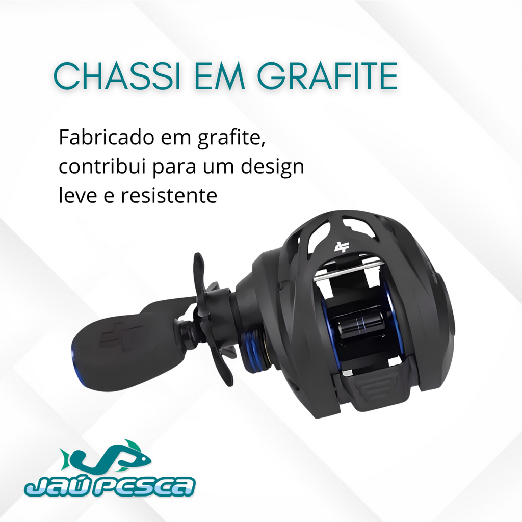 Fabricada com um corpo em grafite, carretel de alumínio reforçado, sistema de rotação unidirecional, engrenagem de tração forte e um drag de 9kg.