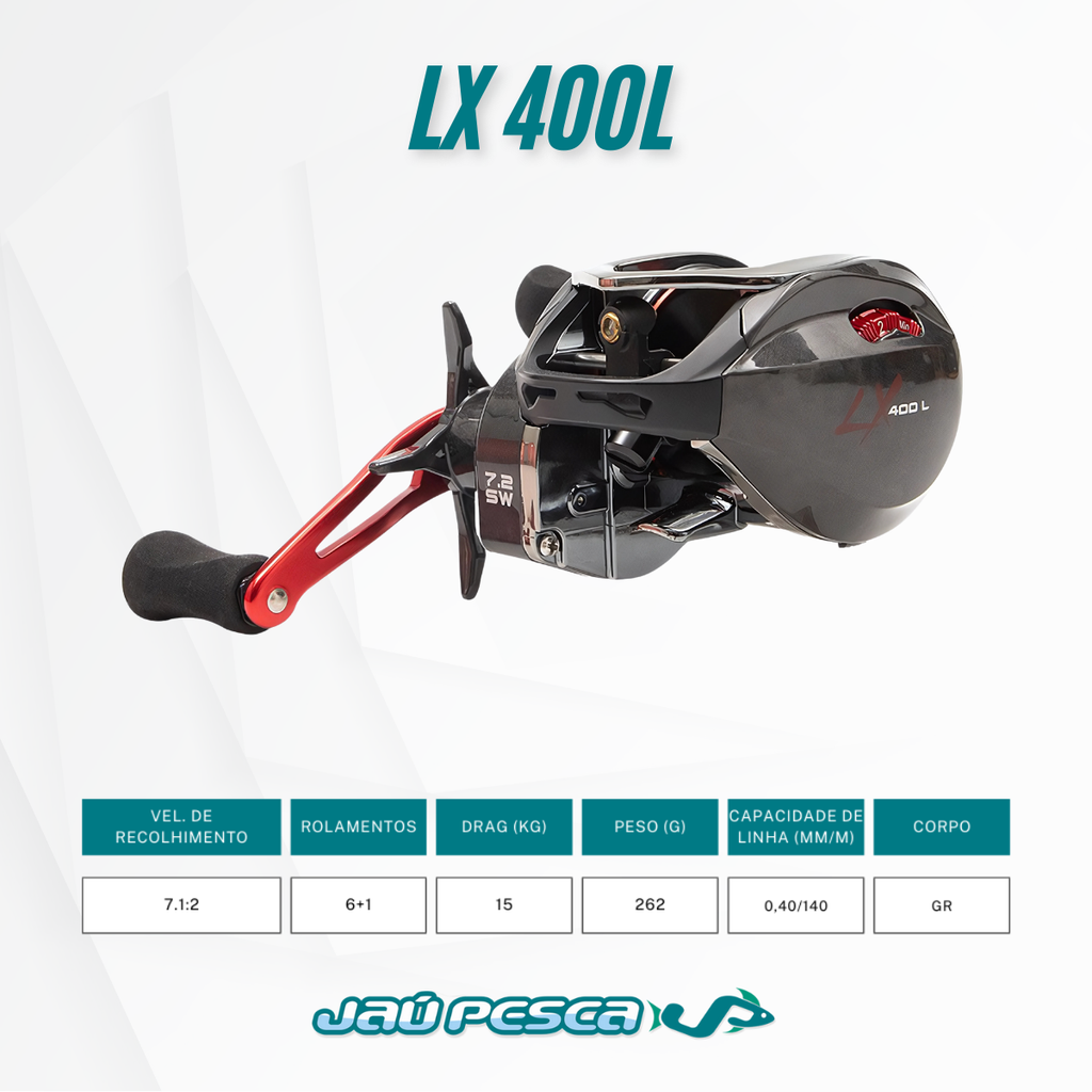 A carretilha LX 400L da Pop Fishing possui um sistema de arremesso com freio magnético com regulagem externa ponto-a-ponto, e engrenagem com coroa e pinhão em bronze garantindo mais durabilidade e segurança.